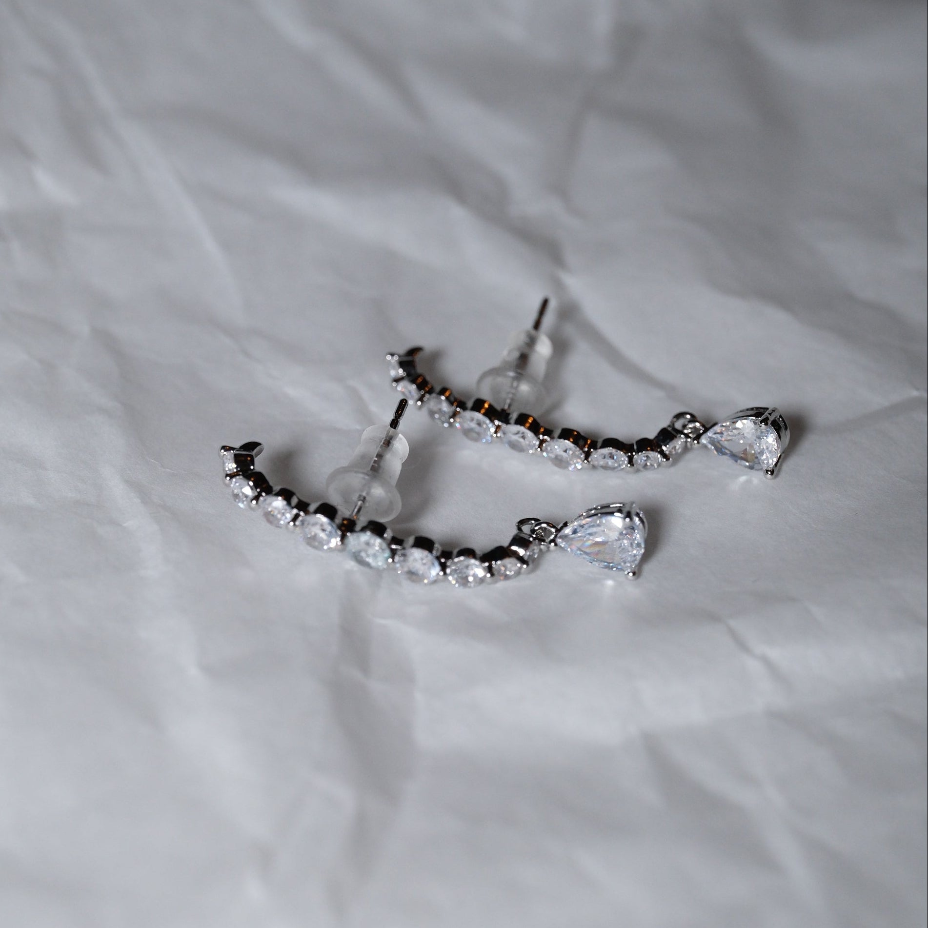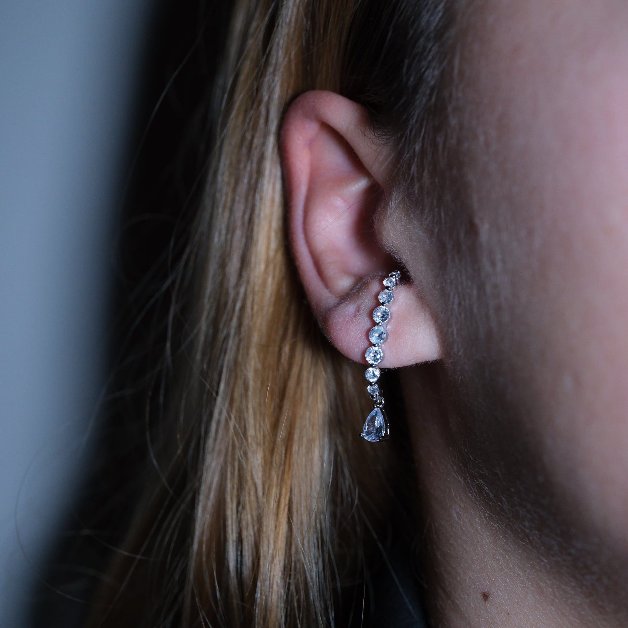 Pirinç üzeri kaplama, zirkon taşlı kulağa tam oturan tek taş sallantılı küpe