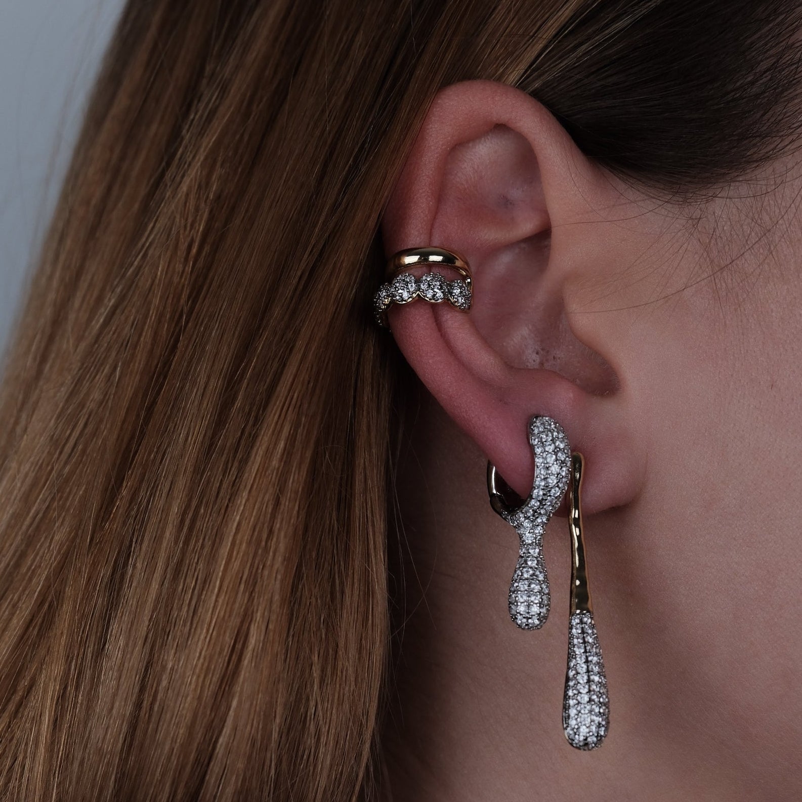 Pirinç üzeri kaplama, zirkon taşlı çift renkli, sallantılı küpe